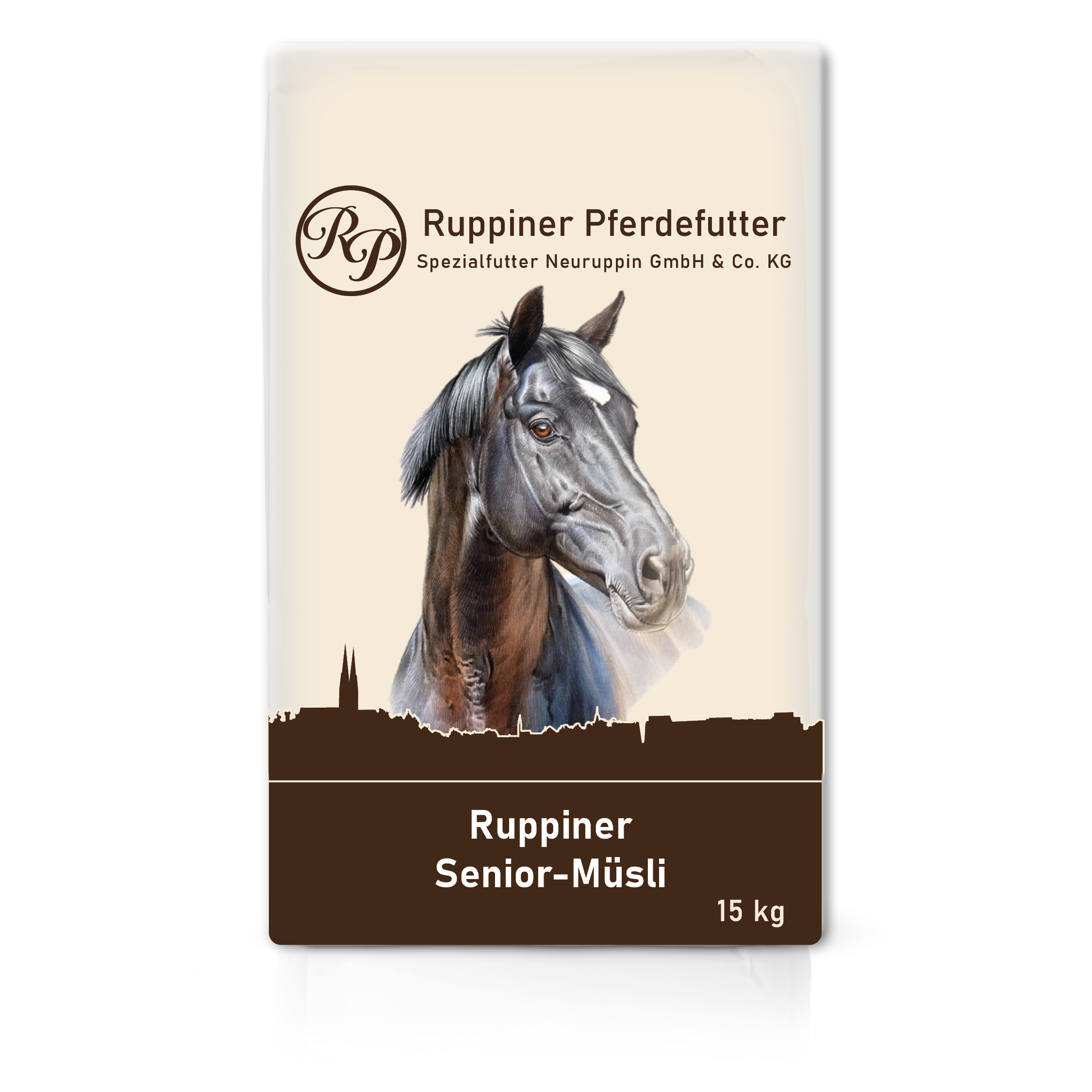 Ruppiner Senior Müsli ist ein eigens für ältere Pferde entwickeltes Müsli, das dem altersbedingten Substanzverlust entgegenwirken kann. Pferdesenioren haben einen erhöhten Protein-, Energie- und Selenbedarf. Unser Senior Müsli hat durch seinen hohen Öl - Anteil sehr positive Effekte auf Haut und Fell. Zudem stellt es Energie bereit, ohne dabei den Blutzuckerspiegel zu erhöhen. Ein besonderer Bestandteil von Ruppiner Senior Müsli ist Dinkel im Spelz. Dieser trägt dazu bei, dass die Darmtätigkeit angeregt wird, was wiederum eine verdauungsfördernde Wirkung hat. Bestandteile wie Leinkuchenflocken, Bierhefe und Leinöl haben durch ihren hohen Anteil an Omega - 3 - Fettsäuren, Aminosäuren und wertvolle Schleimstoffe einen positiven Einfluss auf Fell, Haut sowie den Magen-Darm-Trakt und wirken gleichzeitig dem Muskelabbau entgegen. Durch seine Bestandteile eignet sich das Müsli auch zum Auffüttern für Pferde jeden Alters. Das Müsli kann für Pferde, die nur noch wenige Zähne haben, auch eingeweicht verfüttert werden.