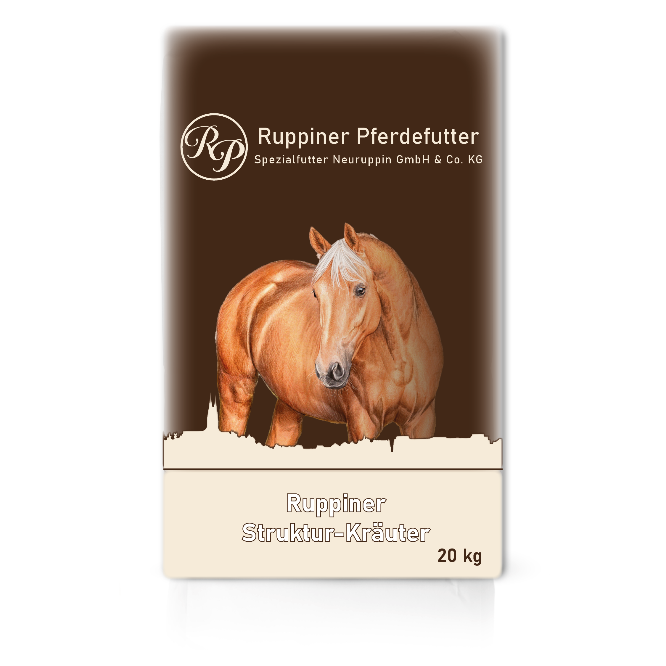 Ruppiner Struktur Kräuter ist ein getreide- und melassefreies Strukturfutter, mit einem sehr geringen Stärke-Zucker-Gehalt. Durch die hochverdauliche Rohfaser ist es für die Fütterung von leichtfuttrigen, empfindlichen oder für Pferde mit leichter Arbeitsbeanspruchung konzipiert. Durch seine grobe Struktur aus Apfeltrester, Luzerne und Kräutern fördert es ausgiebiges Kauen und lange Fresszeiten. Der sehr niedrige Zucker- und Stärkegehalt entlastet den Stoffwechsel.